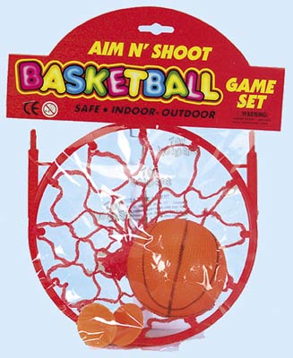 6811NN Basketball Set. Includes a suction cup rim/net (8.25" diameter) and a plastic basketball (3.5" diameter). Package size: 9.75" x 12". 48 sets/inner. Dollar item.