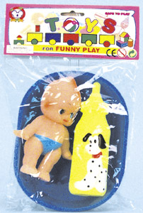 1088/2 Bath Tub Toys. Children's bath toys include rubber baby, rubber bottle, and water container. Assorted colors. Blister card size: 11"x7". 24 pcs/inner.