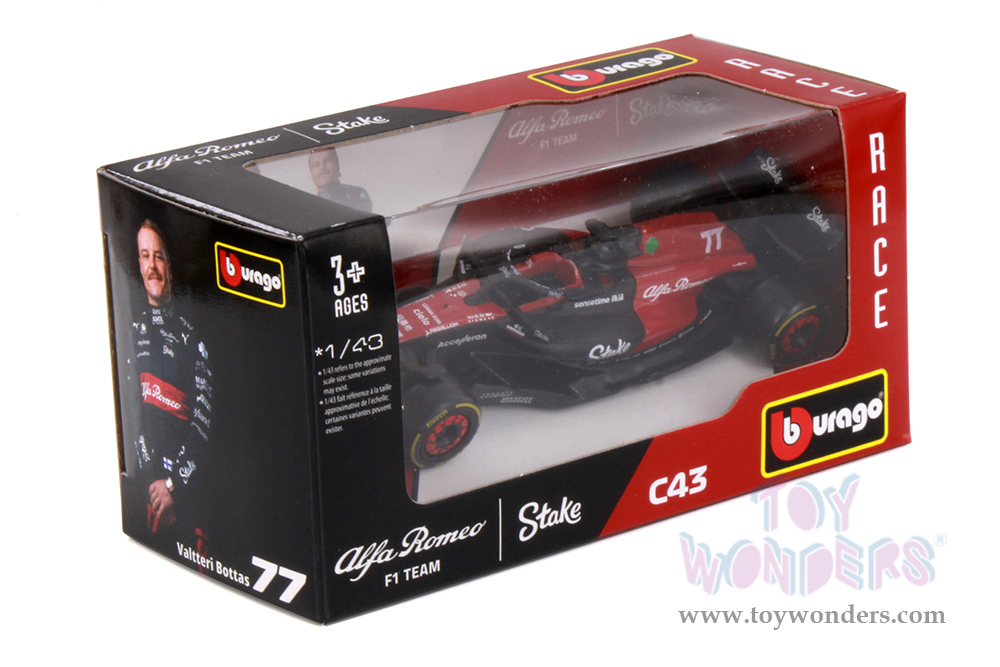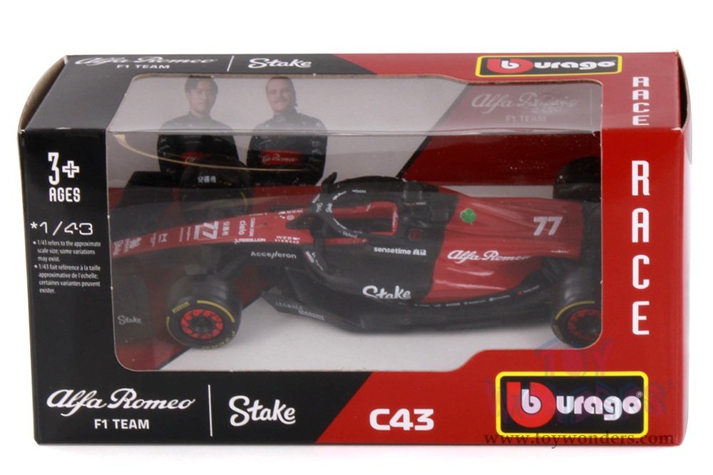 18-38085/77 Bburago Formula Racing - Alfa Romeo F1 Team Stake C43 #77 Valtteri Bottas Formula One F1 Bahrain GP (2023). 1:43 scale diecast collectible model car. This Alfa Romeo Race car is a 5"L x 1.75"W x 1"H die-cast metal car. Extensive detail across the body, electrostatic paint coating. Sponsored by cielo, AMX, Zadara, Vauld and more. This Alfa Romeo Formula 1 is manufactured by Bburago. Item 18-38085/77 is in red and black. Individually packed in a window box. Box size: 5.5"L x 2.5"W x 2.75"H.