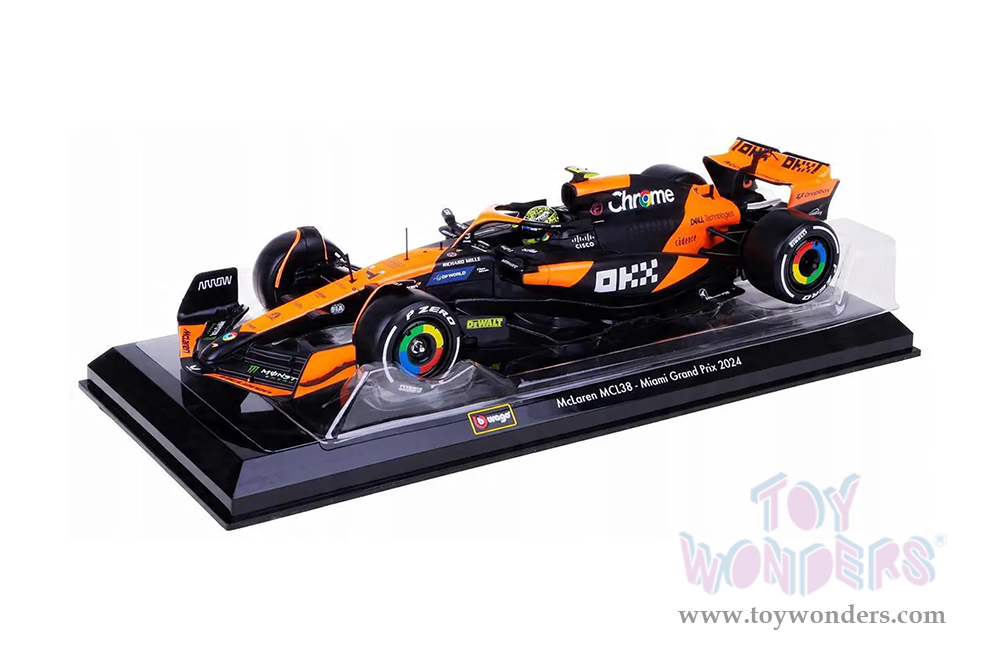 18-28033/4A Bburago Formula Racing - McLaren F1 Team #4 Lando Norris with Driver "OKX" Winner Formula One F1 Miami GP (2024). 1:24 scale diecast collectible model car. This McLaren is a 9"L x 3.25"W x 1.75"H die-cast metal car. Extensive detail across the body, electrostatic paint coating. Sponsored by Chrome, Webex, Arrow, Dell, Monster Energy, Cisco and more. This McLaren Formula 1 is manufactured by Bburago. Item 18-28033/4A is in black and orange. Individually packed in a hard-plastic acrylic display showcase with a black beveled display base covered by a sleeve package. Case size: 10.5"L x 4.75"W x 3.5"H.