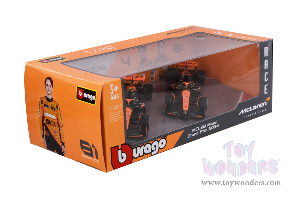 Bburago Formula Racing - McLaren MCL38 2-Pack Miami Grand Prix Formula One F1 (2024) (1/43 scale diecast model car, Black/Orange) 18-38202