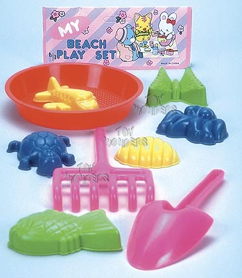 3610 Beach Play Set. 9 piece play set. Great for the beach or sandbox. Includes a sand sifter, rake, shovel & lots of molds for creating different shapes. Package size: 7" x 11". Inner of 12 sets.