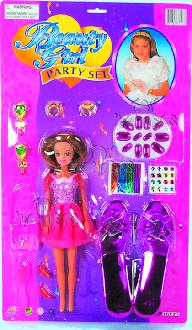 3169 Beauty Girl Party Set. 12" doll, doll costume accessories, and accessories for girls include earrings, rings, press-on nails, glitter stickers, & a pair of purple slippers. Beauty girl doll play set. Card size: 12.5"x21.5". 12 sets/inner.