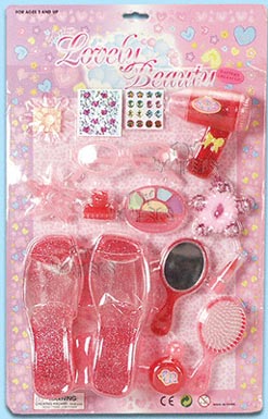 2220/21 Battery Operated Beauty Set. Set comes with Blow dryer, glasses, combs, shoes, etc. Card Size: 12"x19".