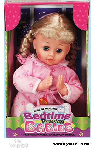 1332SCT Bedtime Praying Baby. This 13" baby doll prays in Spanish. Her mouth moves while praying. Box size: 7”Lx 4”Wx 11.25”H. 12 pcs/inner.