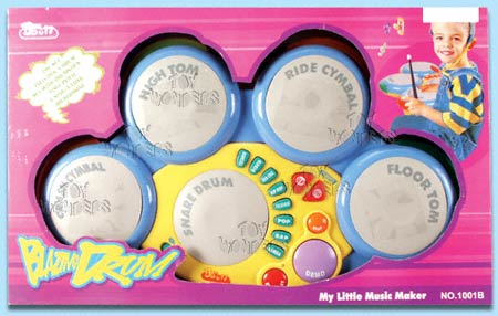 128488LW Blazing Drum. 17.5" drum set that also includes drumstick, foot pedal, a sing-a-long microphone & 8 different rhythms. It records & plays back, volume control & flashing lights while playing. 4 "AA" batteries not included. Pkg size: 19"Lx4.5"Wx12.25"H.