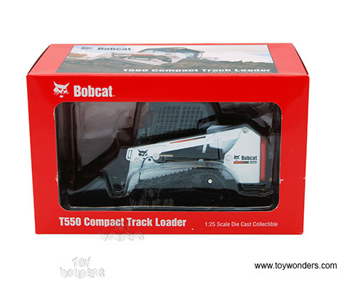 6989079 Bobcat - T550 Compact Track Loader. 1:25 scale diecast collectible model. This T550 Compact Track Loader is a 5.5"L x 3"W x 3"H die-cast tractor. Individually packed in a window box. Box size: 7.5"L x 4.25"W x 4.5"H. This T550 Compact Track Loader is manufactured by Bobcat. Item 6989079 is in White.