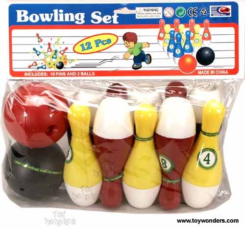 C16081 Bowling Set. Bowling set includes two bowling balls & ten pins. Fun for children of all ages. Package size: 11.5" x 10.5". 12 pcs/inner. Pins are made of sturdy plastic construction; good weight to them -unlike those light hollow pins that are difficult to even keep standing up.