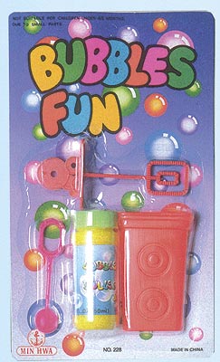 C2281 Bubble Fun Set. Bubble set that includes bubble soap & two different bubble makers. Six assorted styles. Great for party gifts too. Blister card size: 6" x 10". Inner of 2 dozen. Dollar item.