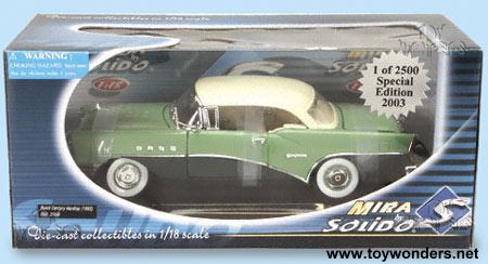 3166 BUICK Century Hardtop (1955) Limited Edition 1 of 2500 pcs Scale: 1:18 Dimensions: 10"L x 3.75"W x 3.25"H Buick die cast metal classic oldies car with workable steering, free wheels, folding bench seat, and opening doors, hood, and trunk, spare tire in trunk, and spring-loaded doors. Detailed engine & components. Sits on a display platform. Box: 12.5"W x 5.5"H x 6"D Manufactured by Mira Solido Majorette Two-toned green colored exterior with ivory colored roof and interior color