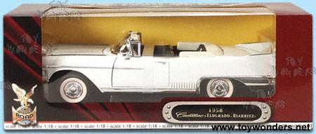 92158W/1 YATMING Cadillac El Dorado (1958) 1:18 scale. 12" diecast metal classic convertible has opening doors/trunk/hood, free wheels, and workable steering. The 1958 Cadillac El Dorado features a detailed engine and components. Deluxe Edition. Road Signature/Yat Ming. Cadillac is a division of General Motors GM. WHITE color.