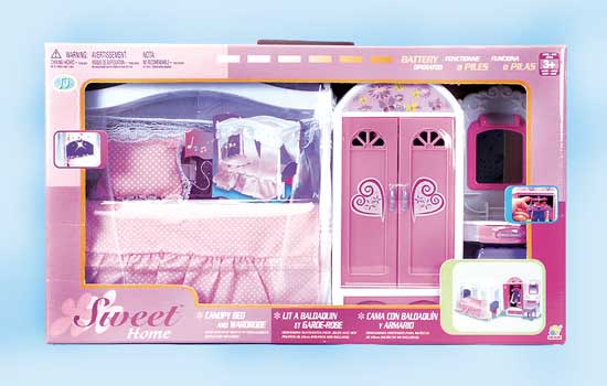 TW3027 Canopy bed & wardrobe set. Canopy bed & wardrobe set has light &accessories, bed, wardrobe, vanity table. Scaled for 11.5" dolls (not included). Requires 4 "AA" batteries. Box size: 21.75"Lx3.75"Wx12.50"H.