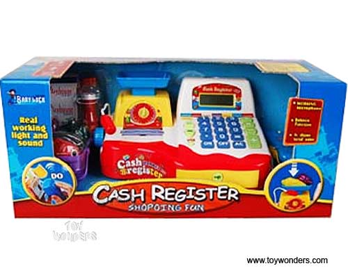 34439 Battery Operated Cash Register with Light and Sound. This supermarket checkout cash register comes with microphone, shopping basket with groceries, play money in cash drawer with key. It features working microphone, working calculator and working scale. Requires 3 "AA" batteries (not included). Box size: 16.75"Lx 7.25"Wx 7.5"H.