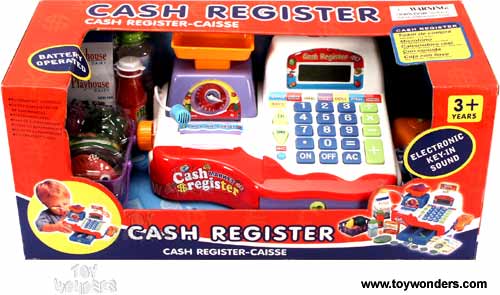 33839 Battery Operated Cash Register with Microphone. This 10" supermarket checkout cash register comes with microphone, 4.25" shopping basket with groceries, play money in cash drawer with key, electronic key-in sound and real calculator. For ages 3 years & up. Requires 3 "AA" batteries. Box size: 17"Lx 7.25"Wx 7.5"H.