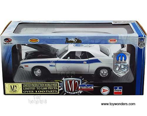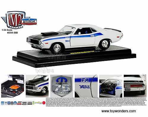 40300/36B02 Castline M2 Machines Auto-Dreams - 1970 Dodge Challenger T/A Hard Top MOPAR 75th Anniversary. 1:24 scale diecast collectible model car. This 70 Dodge Challenger T/A is a 7.75"L x 2.75"W x 2"H die-cast collection car with openable hood, doors & trunk. Each car sits on a display plaque. This Dodge Challenger T/A is manufactured by Castline. Individually packed in a window box WB. Box size: 10"L x 4.75"W x 4.25"H. 40300/36B02 is in PEARL WHITE color with Black roof. Limited edition 1 of 5000 pcs.