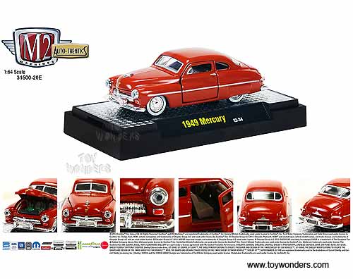 31500/20E Castline M2 Machines - Auto-Thentics 1957 Mercury Turnpike Release 20E. 1:64 scale diecast collectible models. This 49 Mercury is 3" long die cast model car with openable hood & doors. Each car sits on a display plaque, and individually blister carded. Card size is 5.5" x 7.25". This 1949 Mercury is manufactured by Castline. 6 pcs per inner. 31500/20E is in assorted colors.