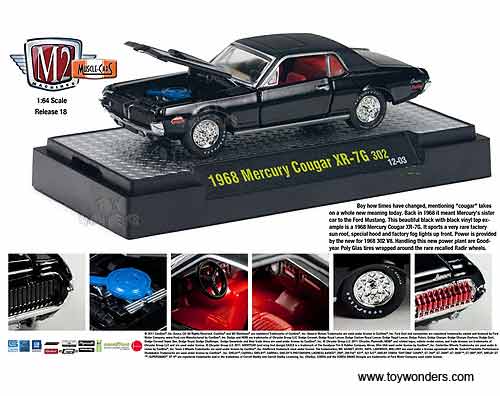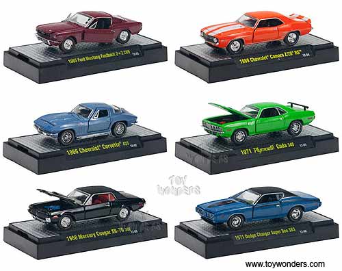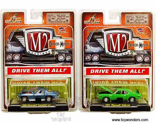 31600/18 Castline M2 Machines - Detroit Muscle Cars Release 18. 1:64 scale diecast model cars, 3" long die cast model cars with openable hood & doors. GM is a trademark of the General Motors Corporation. Each car sits on a display plaque, and individually blister carded. Card size is 5.5" x 7.25". Manufactured by Castline. 6 pcs per inner. Assortment includes: