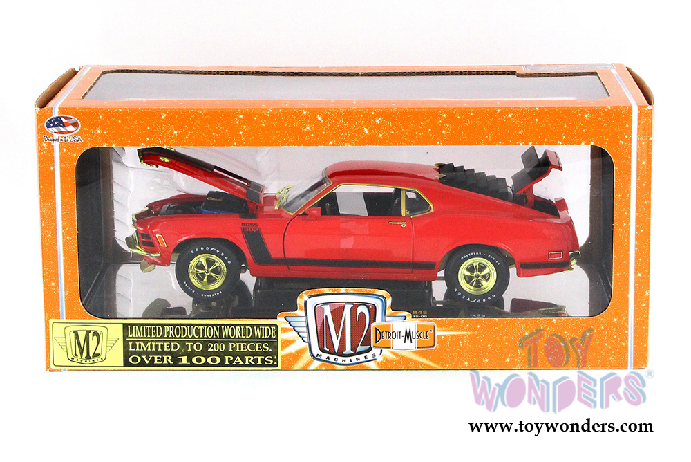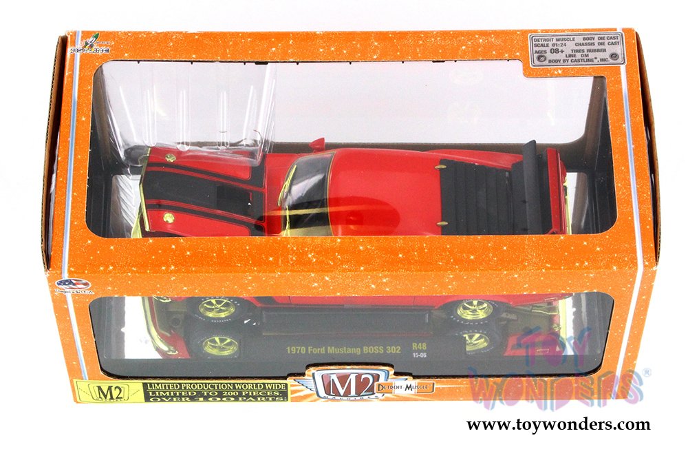 CC40300/48R Castline M2 Machines Detroit-Muscle Premium - 1970 Ford Mustang Boss 302 CHASE Hard Top. 1:24 scale diecast collectible model car. This Ford Mustang Boss 302 is a 7.75"L x 2.75"W x 2"H die-cast collection car with openable doors, hood & trunk. GOLD triming. Each car sits on a display plaque. Manufactured by Castline. Individually packed in a window box WB. Box size: 10"L x 5"W x 4.25"H. Item CC40300/48R comes in RED color with black stripes and gold triming.
