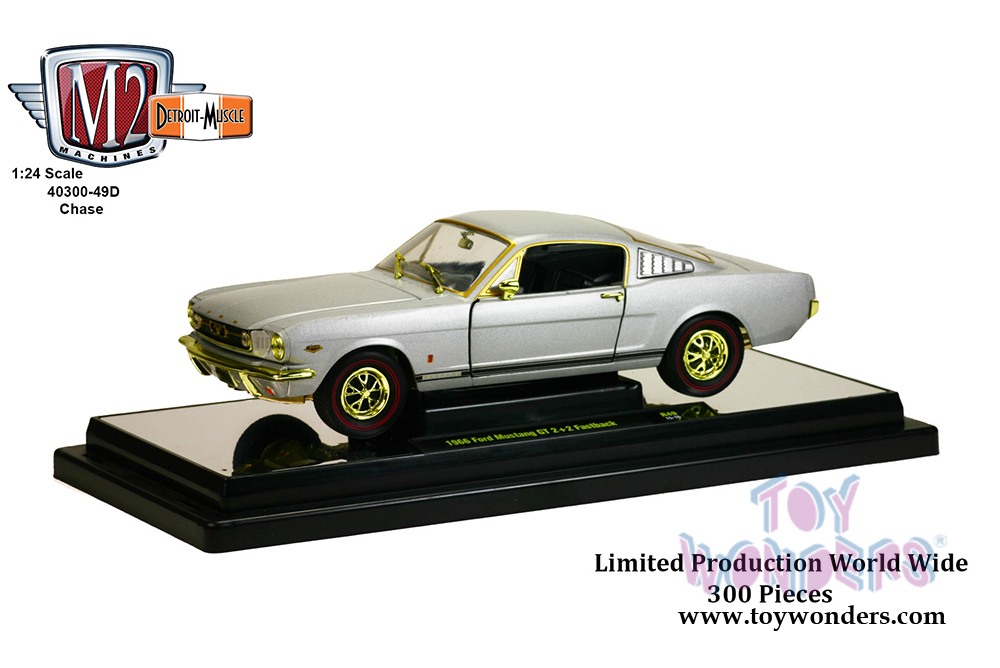40300/49D Castline M2 Machines Detroit-Muscle Premium - 1966 Ford Mustang 2 + 2 Fastback Hard Top. 1:24 scale diecast collectible model car. This Ford Mustang is a 7.25"L x 2.5"W x 2"H die-cast collection car with openable doors, hood & trunk. Each car sits on a display plaque. Manufactured by Castline. Individually packed in a window box WB. Box size: 10"L x 5"W x 4.25"H. Item 40300/49D comes in Silver Frost.