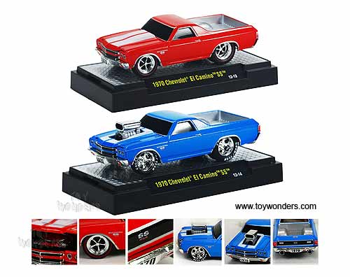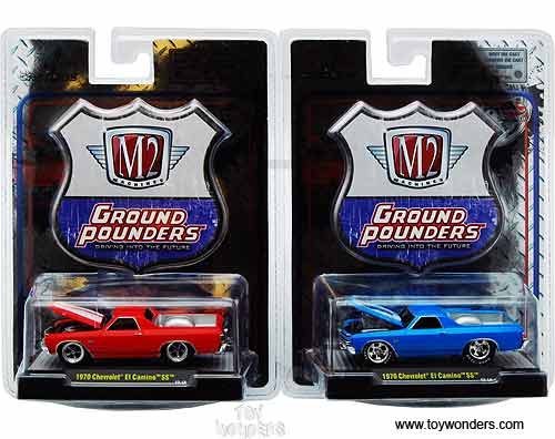 81161/11A Castline M2 Machines - Ground Pounders 1970 Chevrolet El Camino SS Release 11A. 1:64 scale diecast collectible models. This 70 Chevy El Camino SS pickup truck is 3.25" long die cast model car with openable hood. Each car sits on a display plaque, and individually blister carded. Card size is 5.5" x 7.25". This 1970 Chevrolet El Camino SS pick-up is manufactured by Castline. 6 pcs per inner in assorted colors. GM is a trademark of the General Motors Corporation.