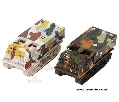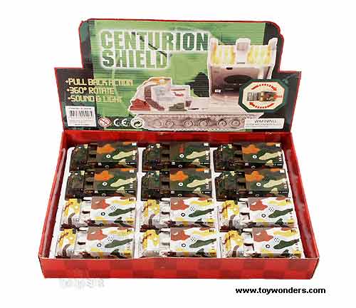 560SL Centurion Shield (With IC sound). This 5.5" diecast military tank has pull-back action. Rear portion of tank like missile carrier pops open with a push of a button, lights, IC missle sounds, and can rotate. No Army base is safe without setting up a perimiter of these patriot missile launchers.12 pcs per display box and in 2 colors. 24 pcs per inner box.