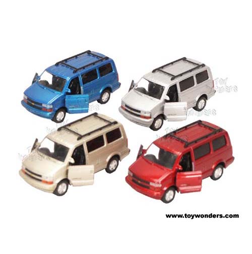 30190 Chevrolet Astro Van. 1:32 scale diecast collectible model car. This 2001 Chevy Astro Van 5" long die-cast metal, mini van with pullback motor action & opening doors. 12 pcs/display in assorted colors. 48 pcs/inner. GM is a trademark of the General Motors Corporation.