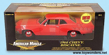 36673PR ERTL - American Muscle Chevrolet Biscayne (1966). 1:18 scale. 11.5" long x 4"Wx 4.5"H, die cast metal classic muscle car with workable steering, sideview mirrors, stick shift detail, exhaust, free wheels, folding seats, and opening doors/hood. This 1966 Chevy Biscayne is features a highly detailed engine & components. Sits on a display platform. Box measures 13.5"Wx 5.75"Hx 6.25"D. RC2 Brands. Carmine RED color.