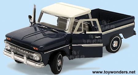 DP8005 Chevrolet C10 Pickup truck (1966). 1:24 scale. 8" long x 3.25"W x 3"H diecast metal, classic 1966 Chevy pick-up truck with opening doors/hood/tailgate and adjustable wheels. 4 pcs per display box and in assorted colors. 12 pcs per inner box. This 1966 Chevy C10 pick up truck is from Saico.