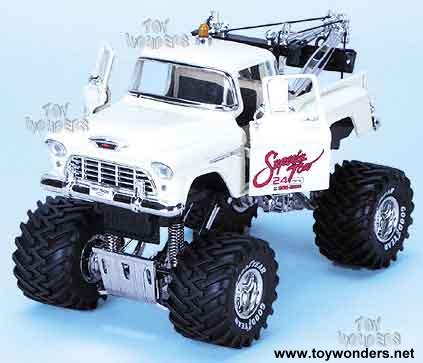 7682D Chevrolet 3100 Stepside Pick Up Tow Truck(1955). 1:24 scale. This 1955 Chevy tow-truck is 8.5" long x 4.75"Wx 5"H, diecast metal, free wheel, and has oversized tires. This 1955 Chevy Stepside pick up has a towing hitch so it get go off road and pick up wrecked cars. The 55 Chevy wrecker also features Good Year tires on workable shocks & spring suspension. Opening doors & moveable tow. Superior/Sunnyside. 3 pcs per display box and in assorted colors.