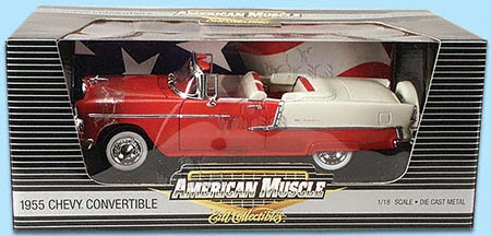33583 ERTL - American Muscle 1955 Chevy Bel Air Convertible (1955). 1:18 scale diecast model car. This 1955 Chevy is a 10"Lx 3.75"Wx 3"H diecast convertible with opening doors & hood, steerable front wheels, detailed engine, interior, & chassis. This 1955 Belair is manufacutred by American Muscle. RC2 Brands; ref. no 33583 in RED color with ivory top.