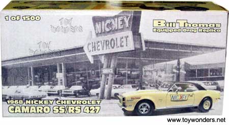 208D EXACT DETAIL Chevrolet Camaro SS/RS (1968) Limited Edition: 1 of 1,500 pcs Scale: 1:18 1968 Chevy Camaro Bill Thomas equipped Drag Replica. Manufactured by Lane Automotives Color: Butternut yellow with black vinyl top