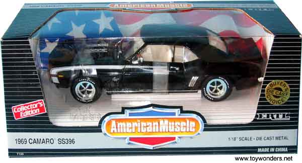 7159BK ERTL - American Muscle Chevrolet Camaro SS396 (1969). 1:18 scale. This 1969 Chevy Camaro features opening hood & doors. White pin striping. White color interior. Good Year tires. This 1969 Chevrolet Camaro SS 396 is manufactured by RC2, Brands. BLACK color.