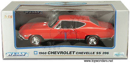 9866R WELLY Chevrolet Chevelle SS396 (1968). 1:18 scale. This 1968 Chevy Chevelle SS 396 is 10.5"Lx 4"Wx 3"H diecast collector's muscle car with opening doors/hood/trunk. The 68 Chevelle features steerable front wheels, detail component and is mounted on a display stand. This 1968 Chevy Chevelle SS396 is manufactured by Welly. RED color.