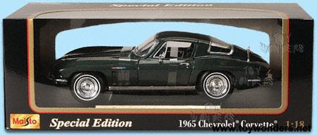 31640GN MAISTO Chevrolet Corvette (1965) Scale: 1:18 Dimensions: 9.5"L x 3"W x 2.75"H 1965 Chevy Corvette die cast collectible muscle car features opening doors/hood, working steering, and detailed interior and exterior. Display platform included. Manufactured by Maisto Color: Green