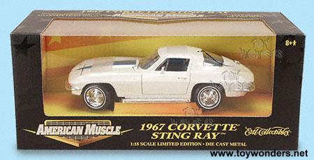 36122W ERTL -American Muscle Chevrolet Corvette Sting Ray (1967) Scale: 1:18 Dimensions: 9.75"L x 3.75"W x 3"H 1967 Corvette die cast metal classic muscle car with working steering, shifter detail, side view mirrors, free wheels, and opening doors/hood. Features a highly detailed engine & component. Manufactured by RC2 Brands Individually packaged in window box Window box: 13.5"W x 5.75"H x 6.25"D Color: White with blue stripe & interior