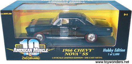 36678BK ERTL - American Muscle. Chevrolet Nova SS (1966). 1:18 scale. This 1966 Chevy Nova SS is a classic diecast muscle car collectible with opening doors/hood. Steerable front wheel. Display stand. 10 Years Anniversary Limited Hobby Edition 1 of 5,000 pcs. This 66 Nova is manufactured by RC2 Brands. BLACK color.