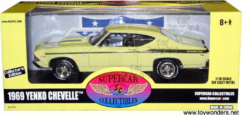 29273PY SUPERCAR Chevrolet Yenko Chevelle (1969) Scale: 1:18 1969 Chevy Chevelle Supercar die cast collectible with black stripe on hood & sides. Outfitted with Good Year tires. Manufactured by RC2 brands/ERTL Color: Yellow with black interior