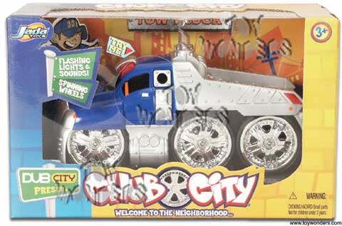 83009 Chub City Fire Truck and Tow Truck. 8" long. Press button on side for flashing lights, music and spinning wheels. From the makers of DUB City. Jada Toys. Window box. Requires 3 "AA" (included). 2 available styles: Fire Truck (not shown), Tow Truck