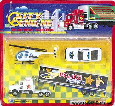 629/3 City Engine, 2.5" to 8" diecast metal assorted vehicles set includes helicopter, tractor trailer, and car. Assorted styles in police, fire rescue, and military. Blister card. 36 pcs/inner. Sold by case pack: 144 pcs, 55 lbs/6.30 cu-ft. $0.70/pcs.