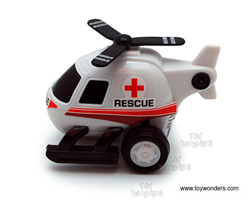 309D City Movers - Mini Helicopter. Rescue Team. This Helicopter is 4"L x 2.5"W x 3"H with friction powered and rotating chopper. 12 pcs per display box in assorted styles (rescue & police). 36 pcs per inner box. Sturdy plastic construction and contains no diecast metal. High quality frictionized motor; one push goes a long way.