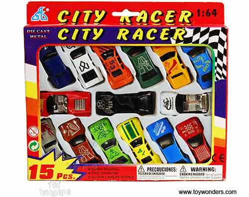 927/15S City Racer Vehicle Play Set. 1:64 scale diecast cars. 15 pcs vehicle playset includes assorted style race cars. Diecast vehicles are approximately 2.75" long and free wheeling. Box size: 9"Lx 7"Wx 0.75"H. 48 sets/ inner.