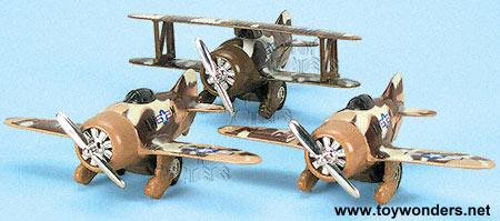 998MD Classic Wing airplanes. 4.25" long x 6" wingspan, diecast metal classic airplanes with rotating propeller and pullback motor action. In 2 assorted styles: bi-plane and single wing air planes. 6 pcs per display box and in assorted camouflage colors. 60 pcs per inner box. ZM2.