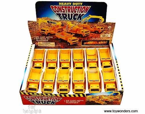 9531D Construction Dump Trucks. 4.5" diecast metal with plastic construction truck that can haul its cargo and dump its load. Features pullback motor action. 12 pcs per display box in YELLOW. 72 pcs per inner box.