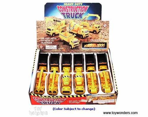 9531/4 Construction Trucks. 4" long diecast metal yellow construction trucks feature with pullback motor action and movable parts. 12 pcs per display box in assorted styles (dump truck, shovel, crane, and cement mixer). 72 pcs/inner.