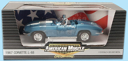 33568BU ERTL - American Muscle Corvette L-88 Roadster (1967). 1:18 scale diecast model. This 1967 Chevrolet Corvette is a 9.5"long diecast convertible with opening doors & hood, steerable front wheels, detailed engine, interior, and chassis. This 67 Chevy Corvette is manufactured by RC2 Brands. BLUE color.