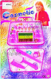 6801 Cosmetic Play Set. Girly play set includes colorful glitter fingernails, stickers, little brush and more. All in a little carrying case. Assorted styles. Card size: 11.5"x7.25". 36 pcs/inner.