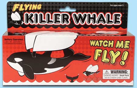 9029 DY TOYS Flying Killer Whale. 7.5" battery operated flying killer whale. It flies around in a circular motion on a string with flapping wings with 16" wingspan. Requires 2 "AA" batteries (not included). Box size: 9.5"L x 3"W x 6"H.
