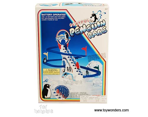 2017 DY TOYS Penguin Race. 14.5" slide set. These flightless arctic penguins climb up the stairs and glide down the slide. Great attention getter. Box size: 9"L x 3"W x 12.75"H. Requires one "D" battery (not included). Requires some simple assembly; no tools necessary.