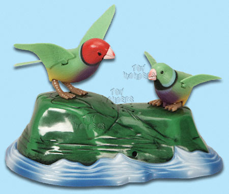 9625 DY TOYS Song Birds of Nature. Two 2.5 - 3" singing birds with authentic bird sounds. Motion activated. Birds flap wings/tail while singing. Detailed color/features. Requires 3 "AA" batteries. Box size: 6.75"L x 3.5"W x 4.75"H. Great bird movement simulation; excellent bird sounds.