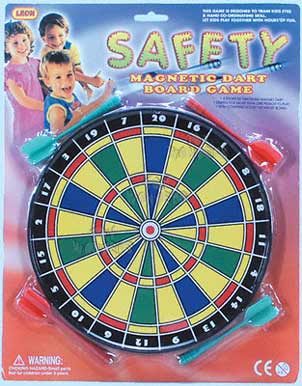 888AB Dart Board Game. 10" dart board game with four safety darts with powerful attraction. Includes 2 different designs for dartboard. Card size: 14"L x 11"W. 12 pcs/inner.